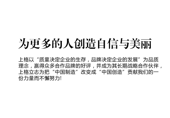 上格一路走來,以“締造時(shí)尚集團(tuán),使公司受人尊敬,令人向往;為客戶提升價(jià)值,創(chuàng)造成功;讓員工提高生活品質(zhì),實(shí)現(xiàn)自我價(jià)值”作為我們的目標(biāo),“為更多的創(chuàng)造自信與美麗” 作為我們的使命,立志為把“中國制造” 改變成“中國創(chuàng)造”貢獻(xiàn)我們的一份力量而不懈努力!